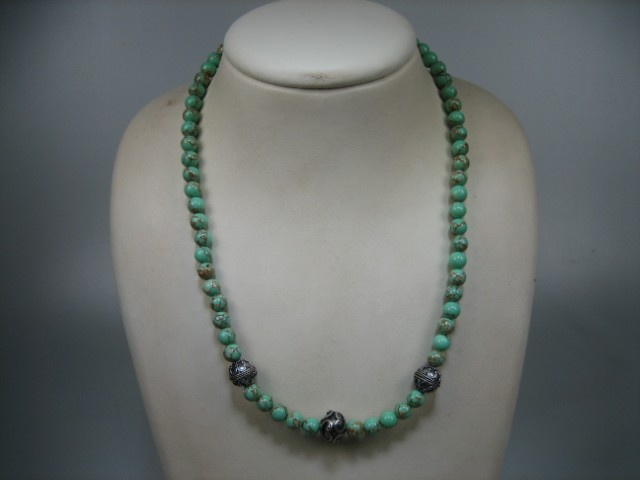 Turkoois collier met oude zilverstukken geheel handwerkHandgemaakt echt Turkoois collier met oudhollandse tussenstukken, met een zilver