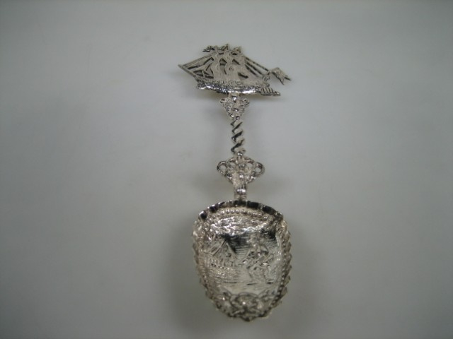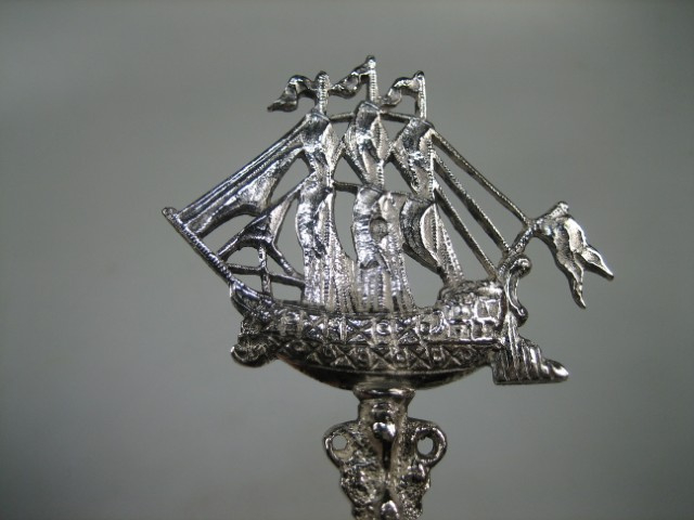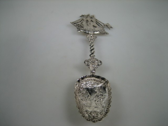 Bovenaan de geboorte lepel is een 3 master te zien in volle zeil met vlag.