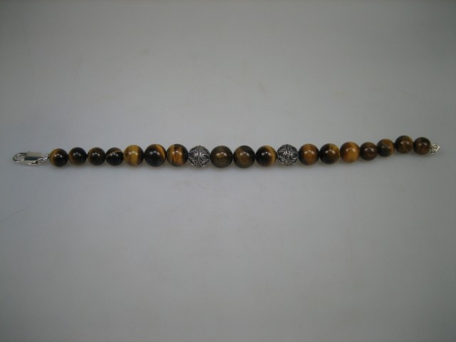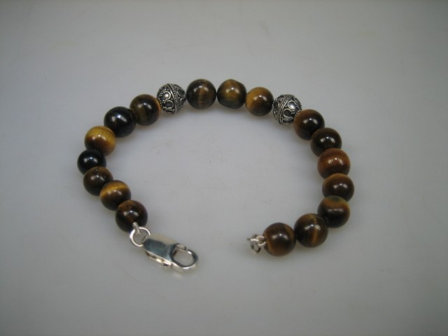 Een armband met tijgeroog ronde geslepen kralen en hoogglans gepolijst tevens een zilveren