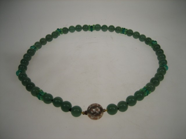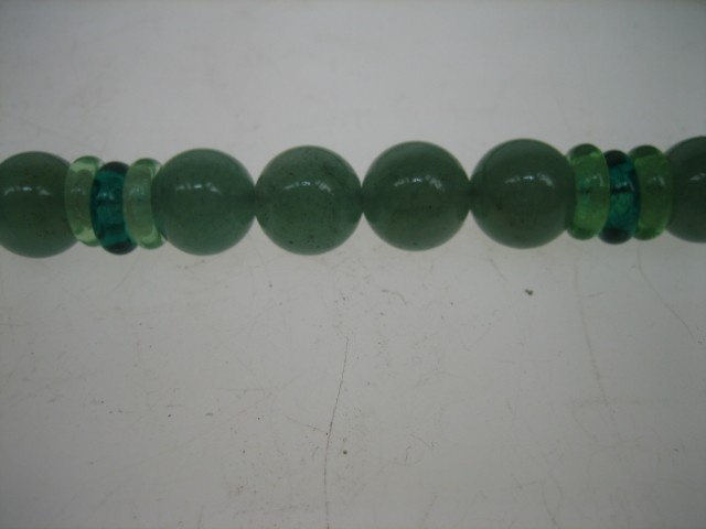 Een zeldzaam mooi collier van Chrysopraas met de kleur appelgroene tot donkergroene variant van chalcedoon uit de kwartsfamilie die zijn kleur dankt aan de nikkel. Tussen de Chrysopraas kralen zitten ook ronde Chrysopraas ringen verwerkt wat het geheel ook exclusiever maakt. De belangrijkste vindplaatsen zijn o.a. in Australië (Queensland en West-Australië), gevolgd door o.a. Brazilië etc. Vanwege de mooie zachte kleur wordt het soms "Australische jade" genoemd wat er dicht bij komt i.v.m. de zuivere kleur.