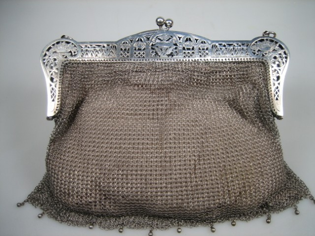 Artikelnummer: KJ21900ZHZilveren Maliënkolders tas met zilveren ketting ca.1906:
