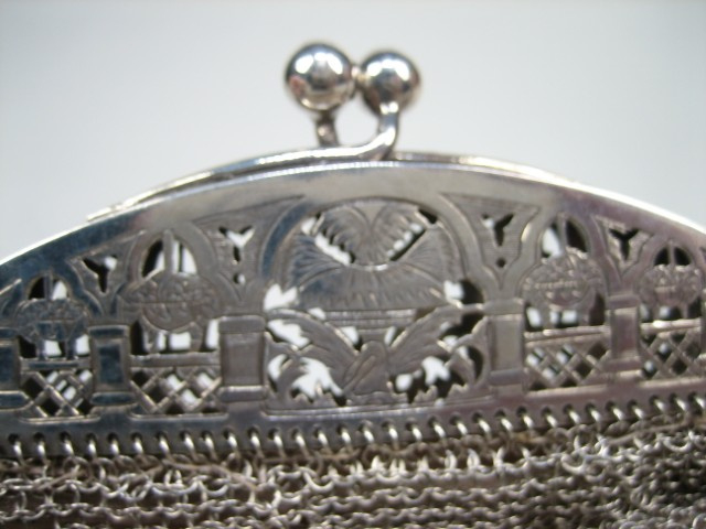 De zilveren Maliënkolders tas is geheel bewerkt en opengezaagd handwerk, en is gekeurd met 4 gehalte keuren aan de voorzijde, en binnen in de beugeltas nogeens met 3 gehalte keuren.